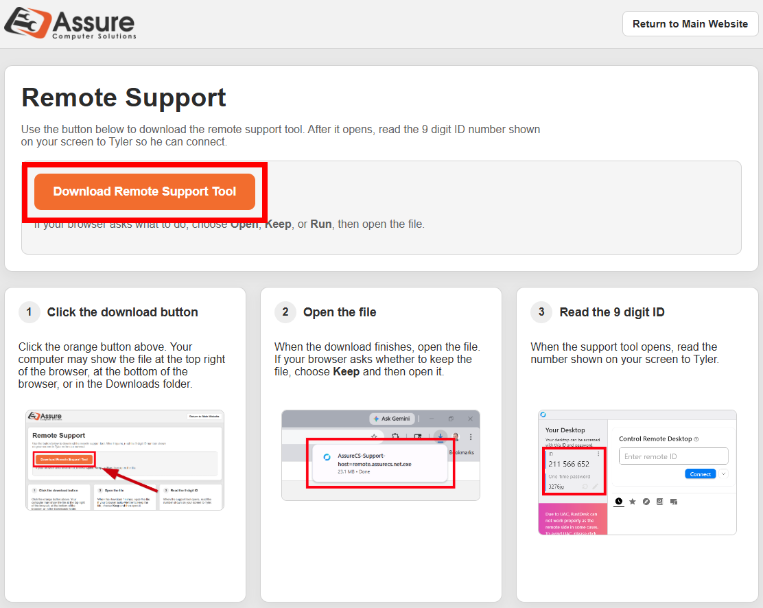 Use the button below to download the remote support tool. After it opens, read the 9 digit ID number shown on your screen to Tyler so he can connect.